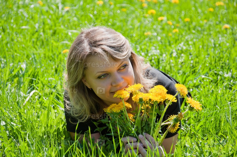 Молодая женщина лежит на весеннем лугу с желтыми одуванчиками