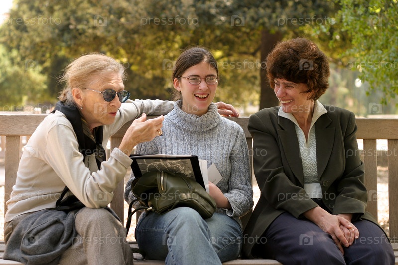 Бабушка, мама и дочка весело беседуют на скамейке