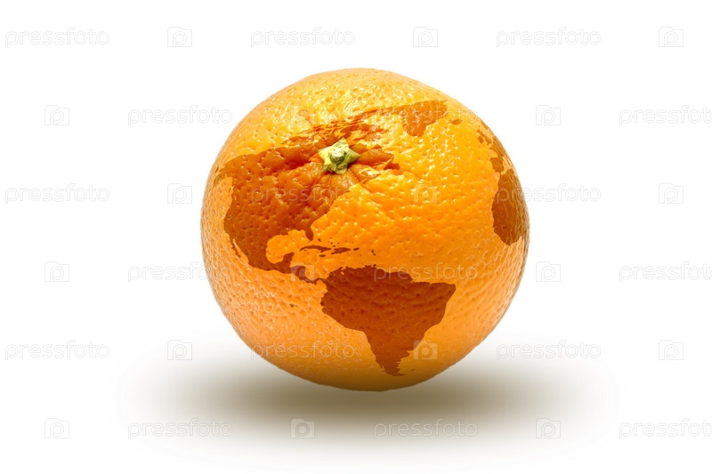 Апельсин в виде глобуса на белом фоне