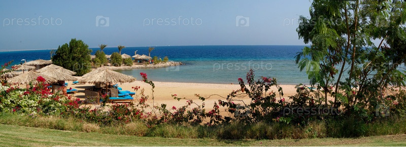 Морской залив и песчаный пляж с зонтиками, панорама