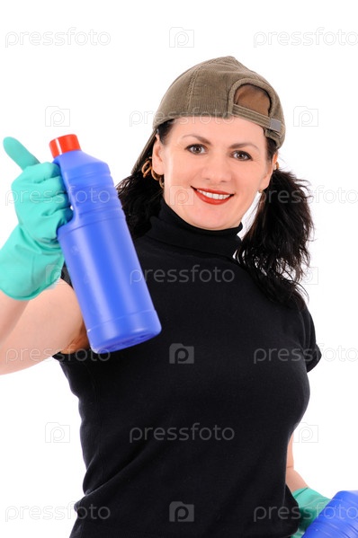Женщина в перчатках с чистящим средством