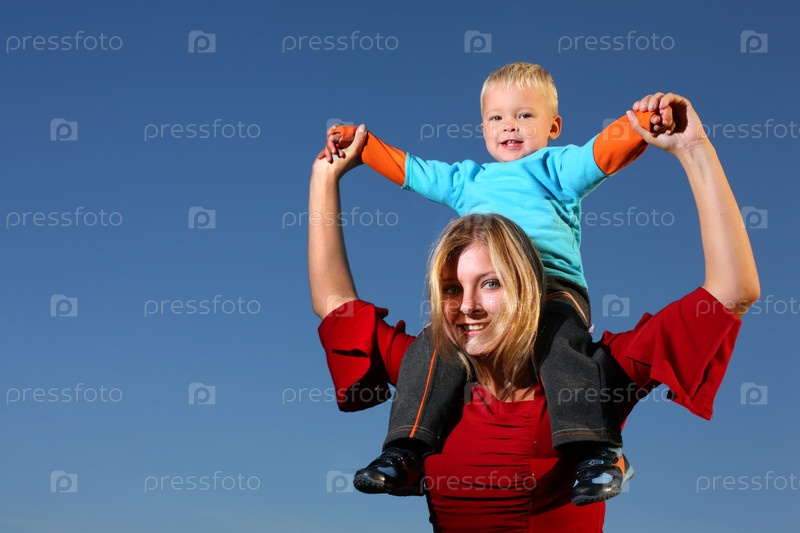 Маленький мальчик сидит на плечах своей мамы