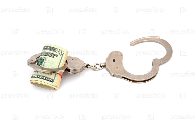 Наручники и доллары на белом фоне