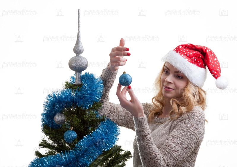 Девушка в шапке Санты стоит около наряженной елки