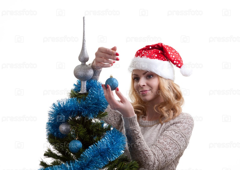 Девушка в шапке Санты стоит около наряженной елки