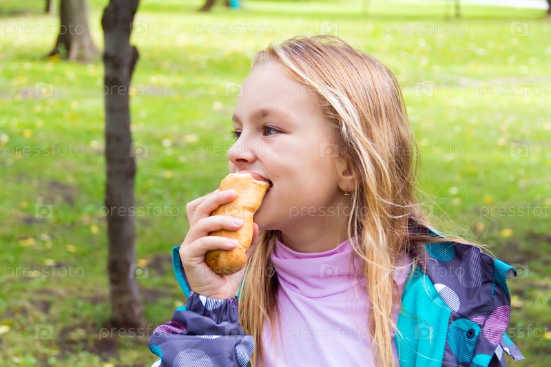 Девочка ест булочку