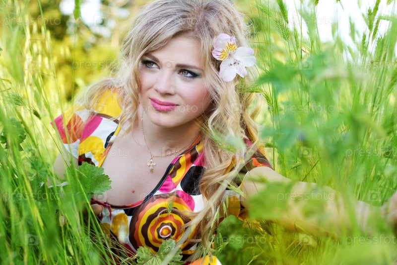 Девушка среди зеленой травы