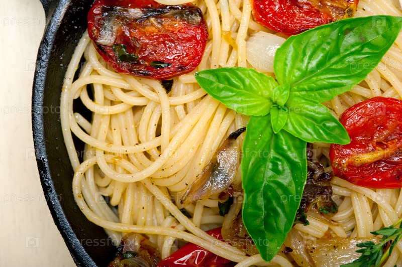 Спагетти с запеченными помидорами черри и базиликом