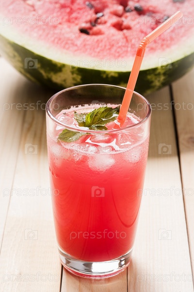 Стакан арбузного сока с листьями мяты и льдом на деревянном столе