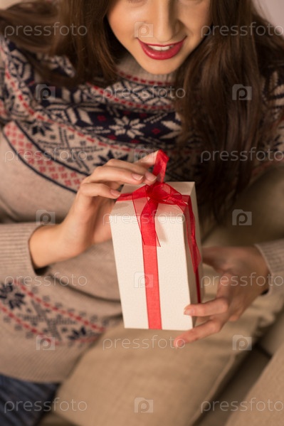 Женщина открывает рождественский подарок