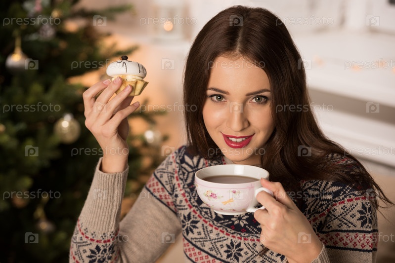 Женщина пьет чай возле елки