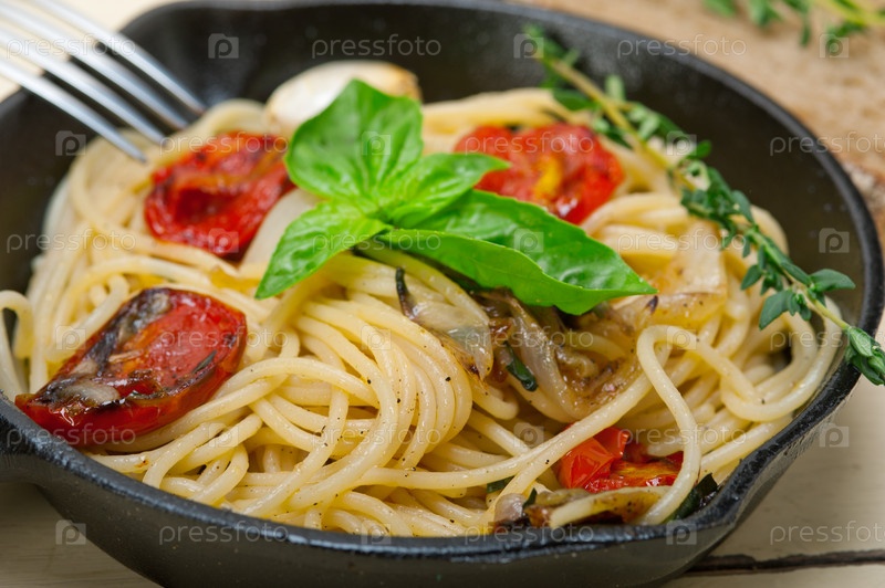 Спагетти с запеченными помидорами черри и базиликом