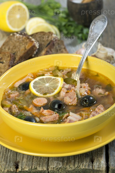 Мясной суп. Традиционный русский суп солянка