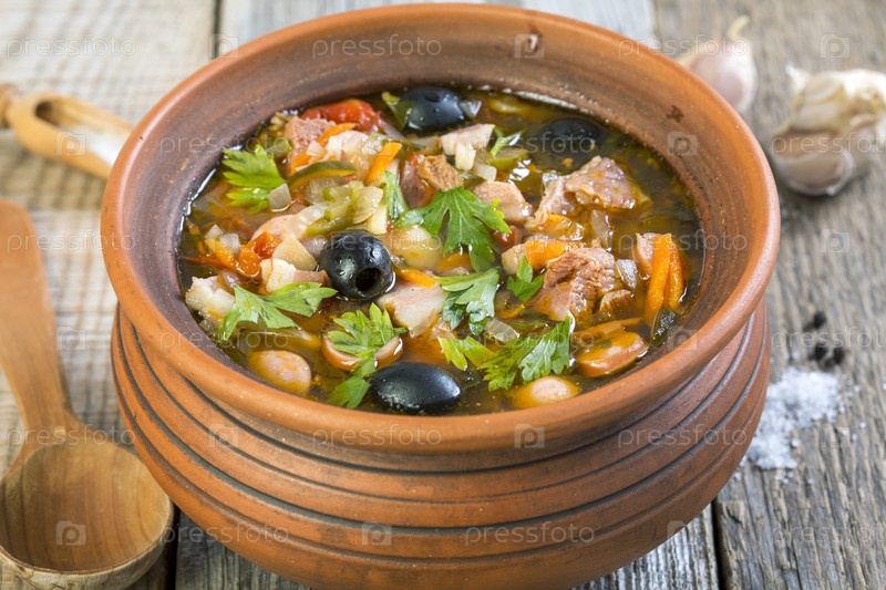 Мясной суп. Традиционный русский суп солянка