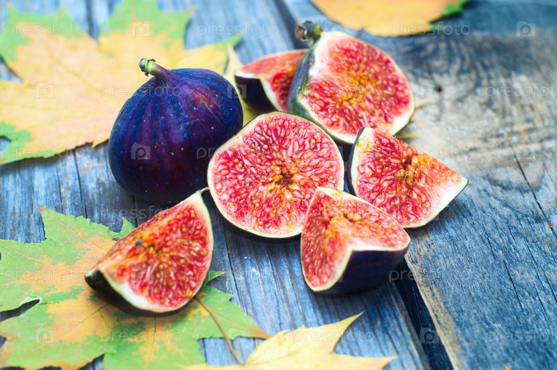 Инжир и желтые осенние листья на деревянной поверхности
