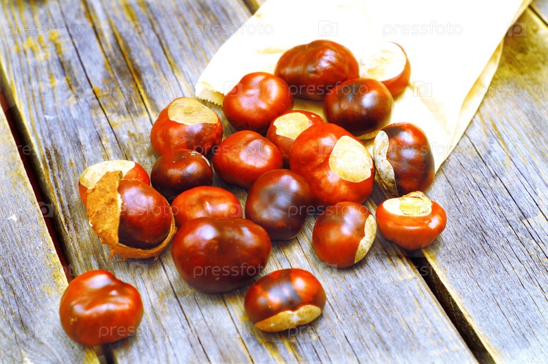 Каштаны на старой деревянной поверхности