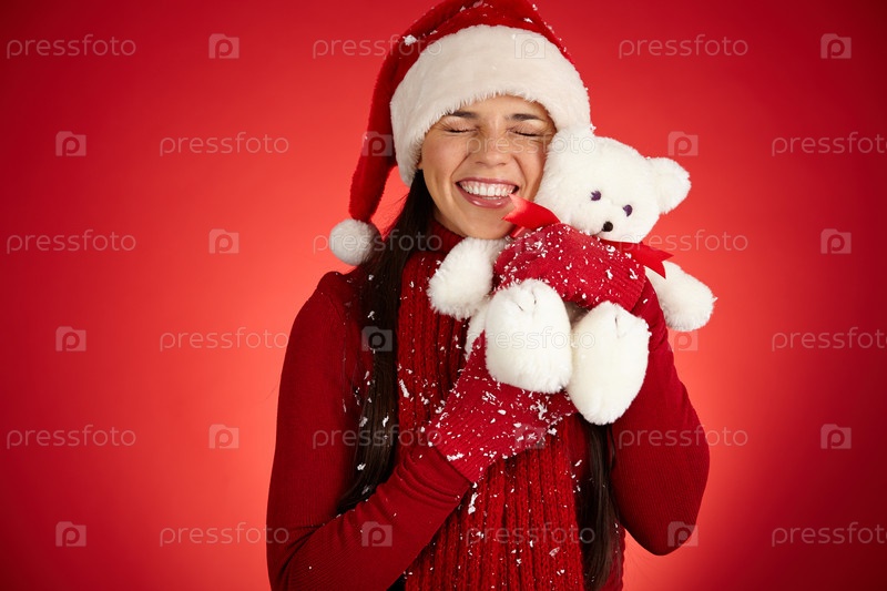 Девушка в колпаке Санты с мягкой игрушкой