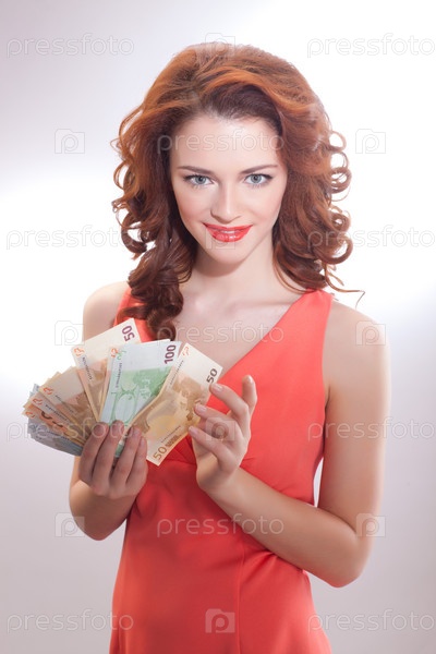 Красивая женщина с долларовыми банкнотами в руках