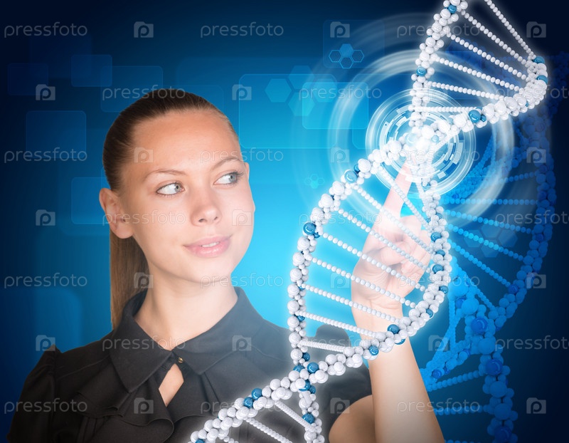 Женщина указывает на цепочку ДНК