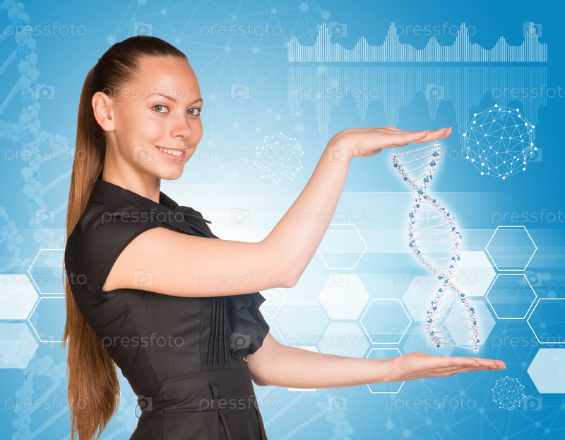 Женщина показывает цепочку ДНК