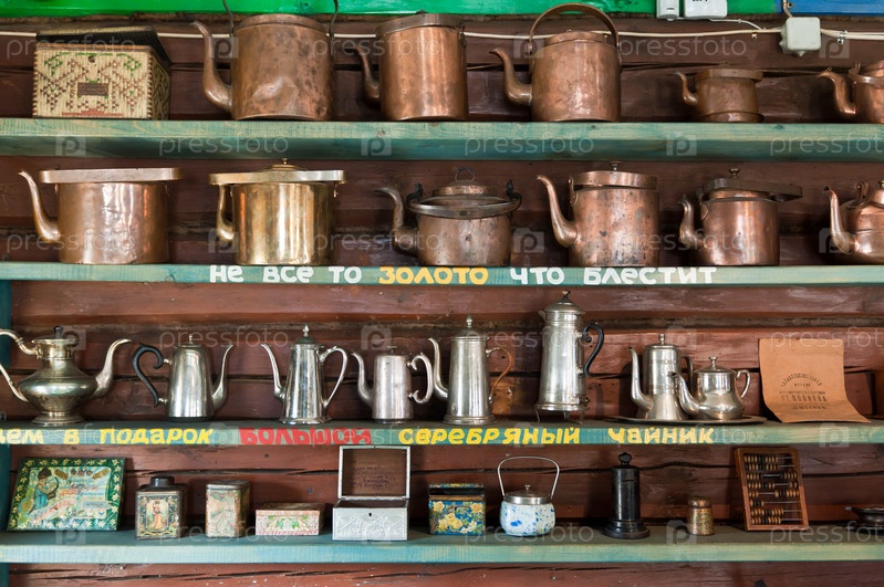 Полки со старинными чайниками