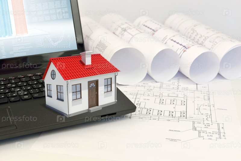 Небольшой дом на ноутбуке и архитектурные чертежи