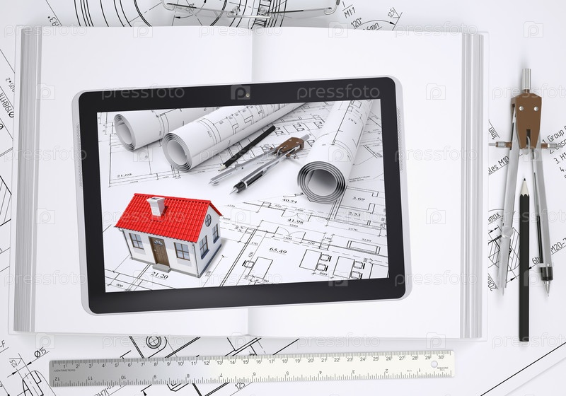Дом и чертежи на экране планшета. Открытая книга и инструменты архитектора