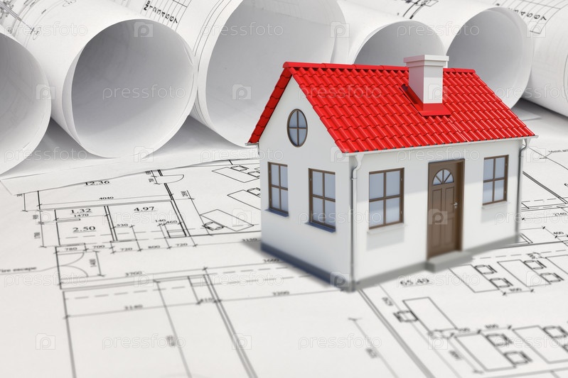 Небольшой дом с красной крышей и архитектурные чертежи