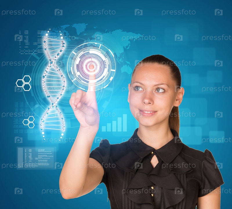 Женщина нажимает на модель ДНК