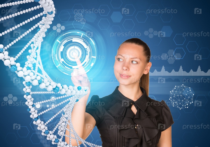 Женщина нажимает на модель ДНК