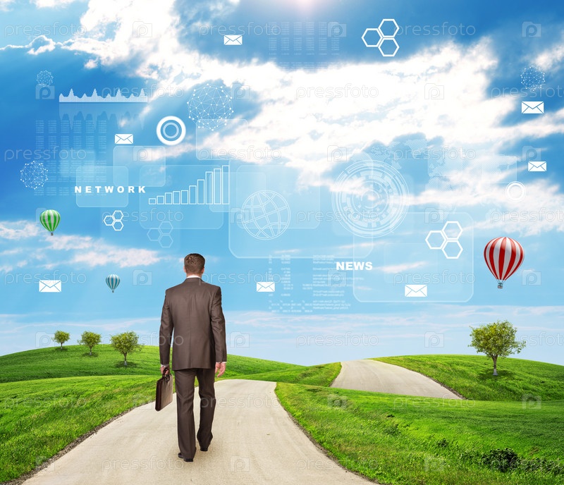 Бизнесмен идет по дороге через зеленые холмы. Карты и иконки в небе