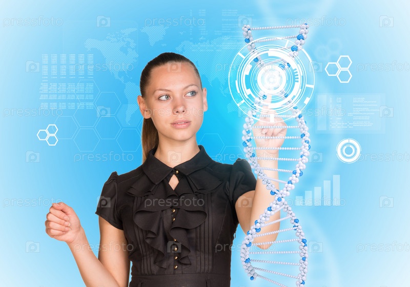 Бизнес-леди нажимает пальцем на модель ДНК