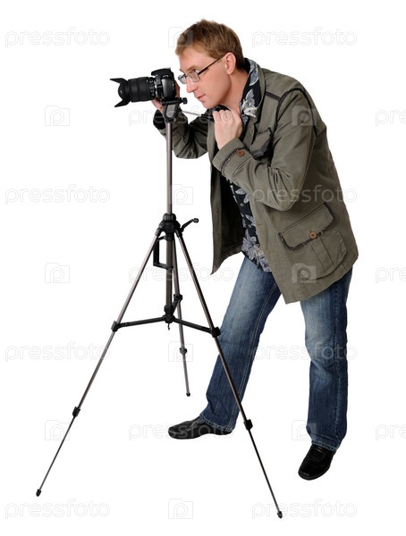 Мужчина средних лет снимает с полупрофессиональной камерой, стоя на штативе