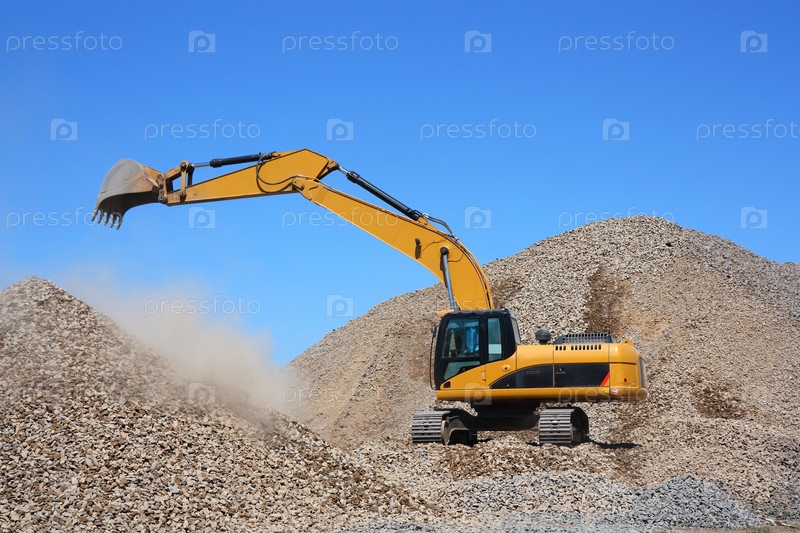 Экскаватор грузит щебень, на фоне неба