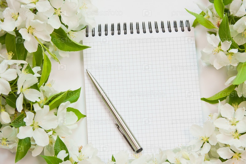 Блокнот, ручка и ветка цветущей яблони вокруг