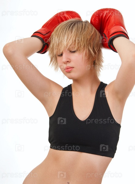 Спортивная девушка в красных боксерских перчатках на белом фоне