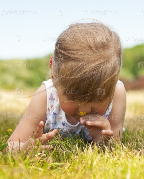 Маленькая девочка лежит на траве и нюхает желтый цветочек