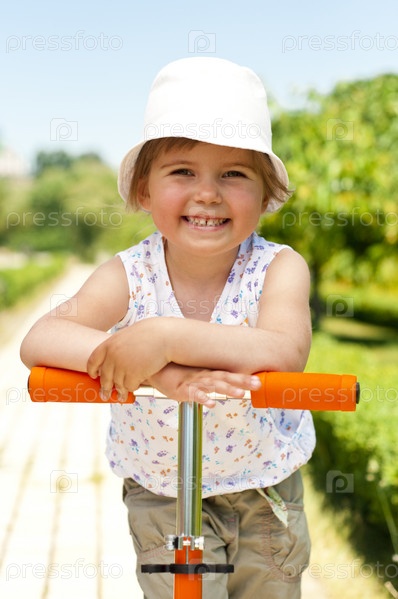 Маленькая очаровательная девочка позирует на самокате в парке
