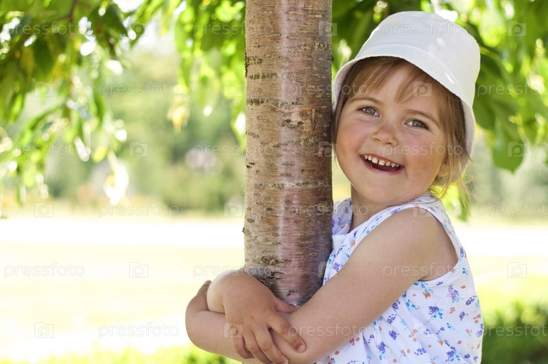 Маленькая очаровательная девочка позирует возле дерева в парке