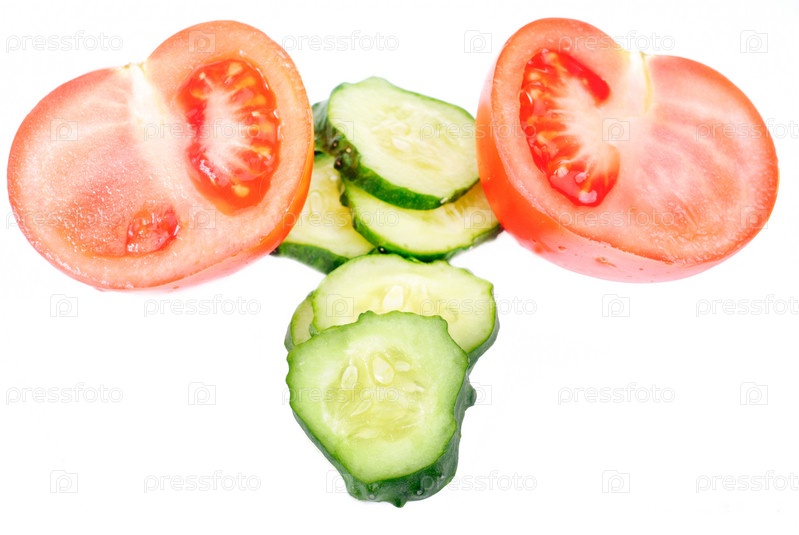 Свежие нарезанные огурцы и помидоры на белом фоне