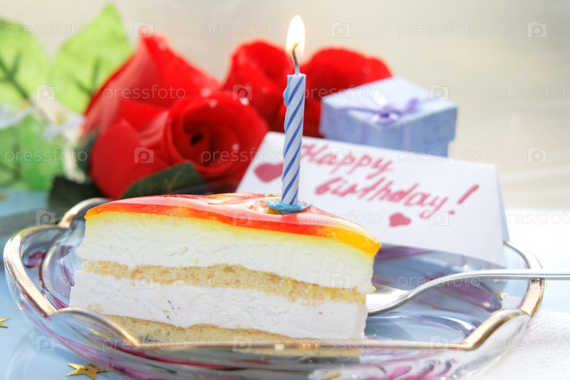 Кусочек торта с горящей свечкой, день рождения