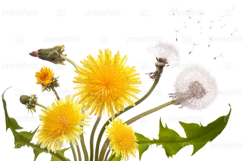 Желтые и белые одуванчики на белом фоне