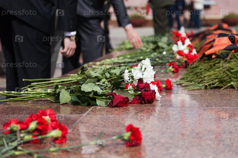 Люди, кладущие цветы к памятнику Великой Отечественной Войны