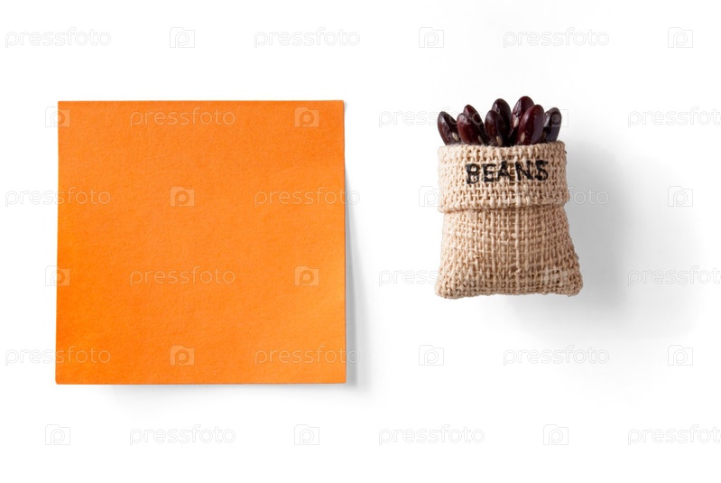 Пустая оранжевая клейкая записка и фиолетовые бобы в упаковке, изолированной на белом фоне