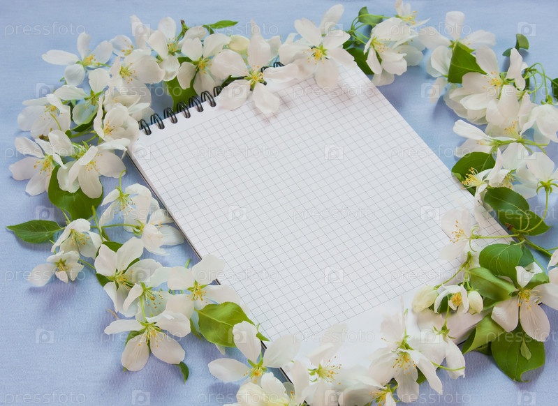 Фон с веточками цветущей яблони и блокнотом