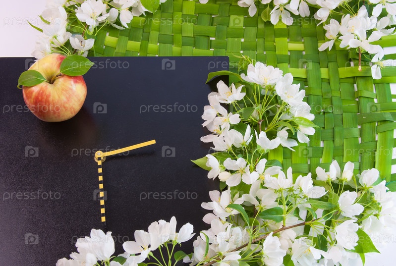 Фон с цветущей яблоней, часами и красным яблоком