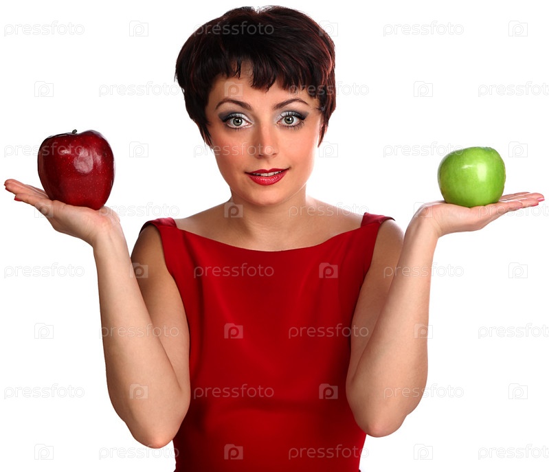 Молодая женщина с красным и зеленым яблоками на белом фоне