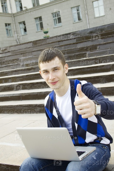 Молодой человек с ноутбуком сидит на ступеньках и показывает большой палец в знак одобрения
