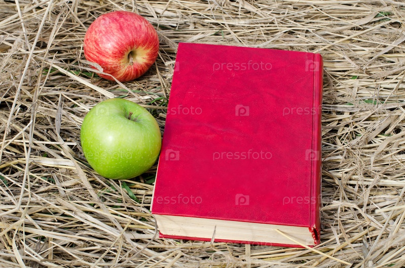 Книга и яблоки на сухой траве