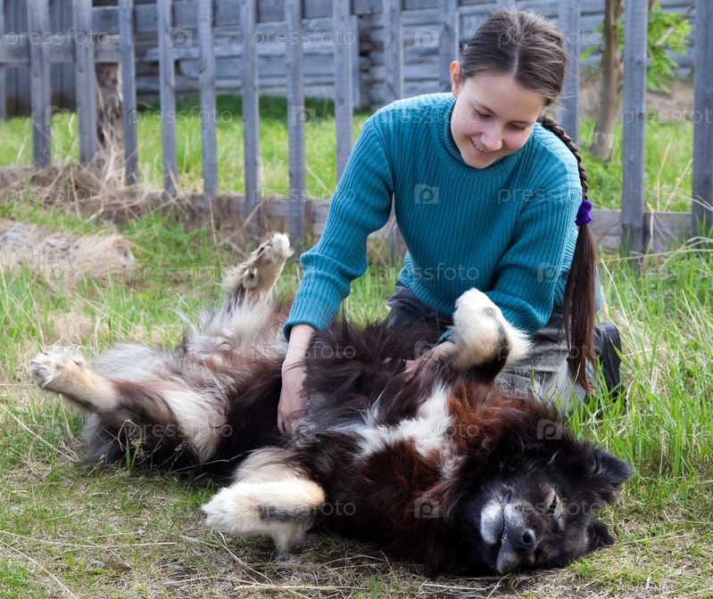 Девочка играет с собакой на зеленой траве